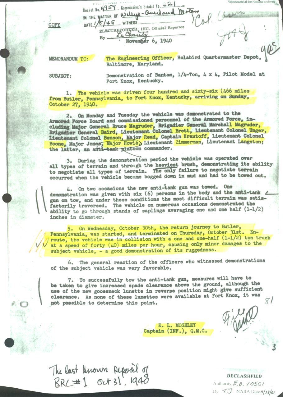 Original Source Documents:    November 6, 1940 - Demonstration of Bantam, Quarter-Ton, 4x4, Pilot Model at Fort Knox, KY - Mosley    details