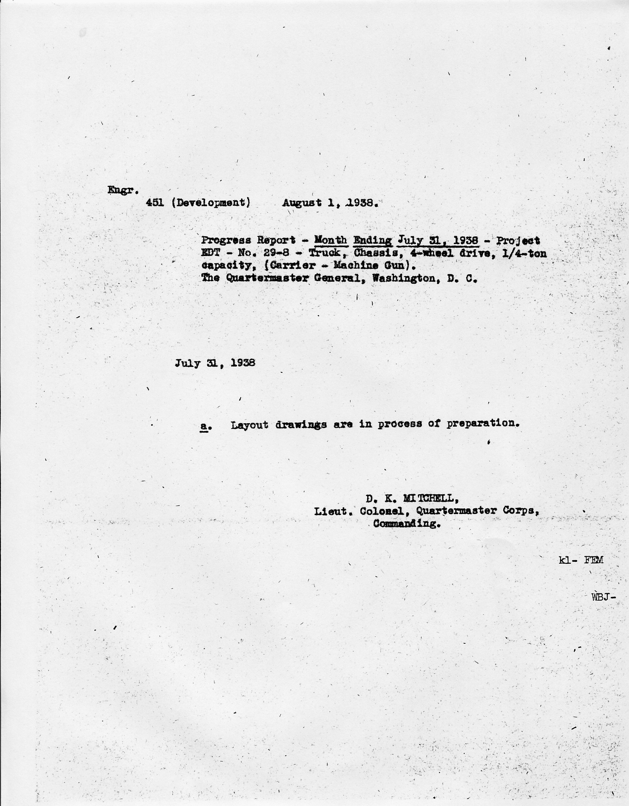 August 1, 1938 - 451 (Development) - Progress Report - Month Ending July 31, 1938 - Project EDT - No. 29-8 - Truck, Chassis, 4-wheel drive, Quarter-ton Capacity (Carrier - Machine Gun) details