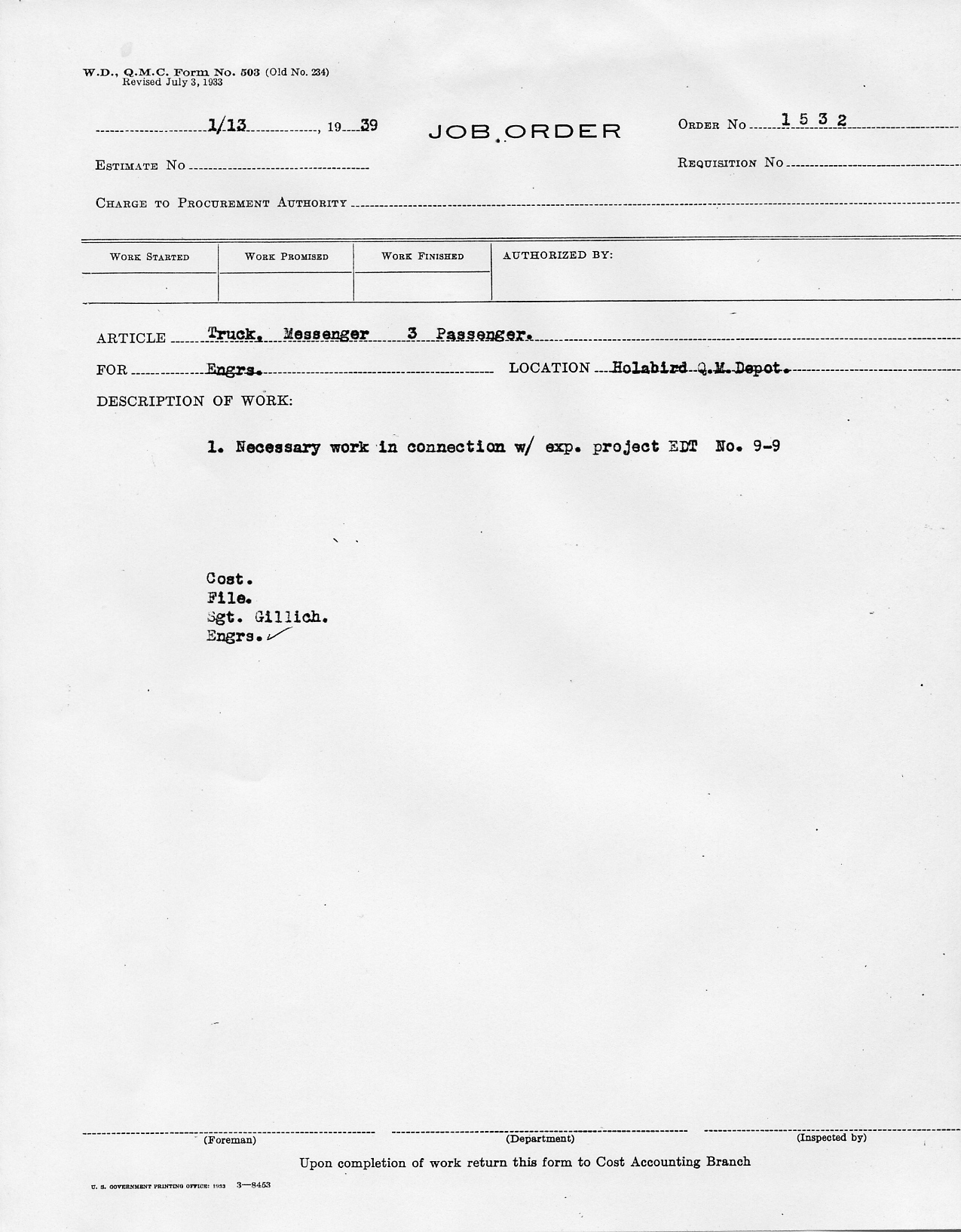January 13, 1939 - Truck, Messenger, 3 Passenger - Job Order 1532 - Exp. Project EDT No. 9-9 details