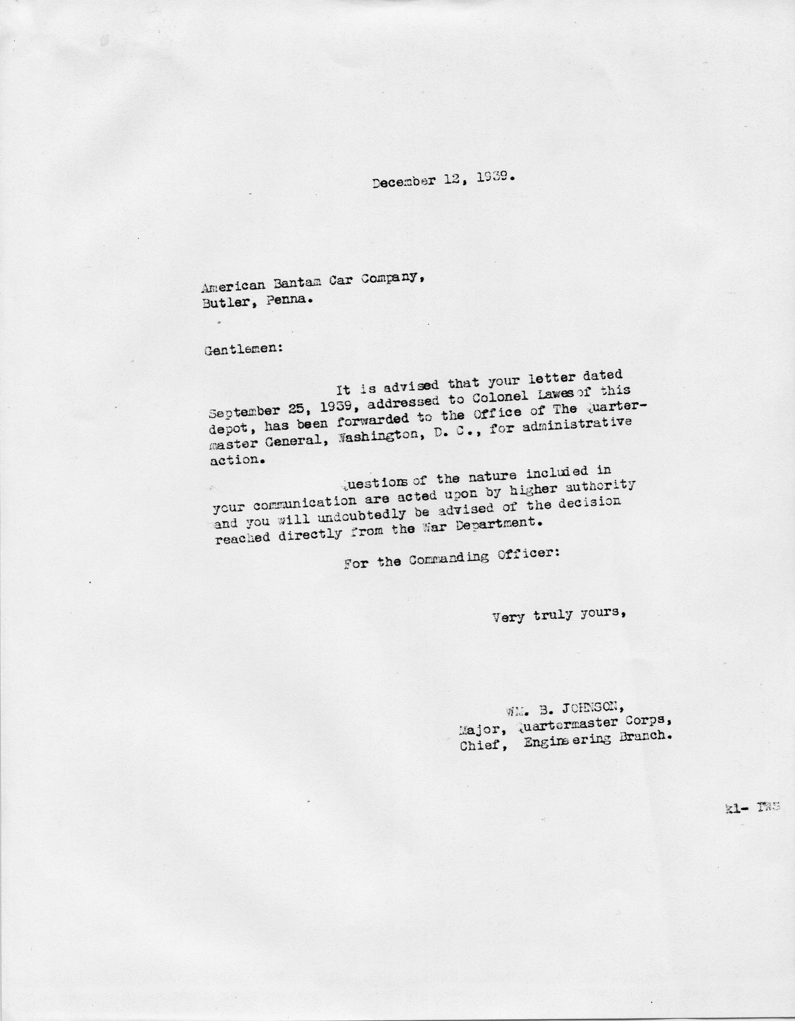 December 12, 1939 - Major William B. Johnson, Chief Engineering Branch, QMC to American Bantam Car Company details