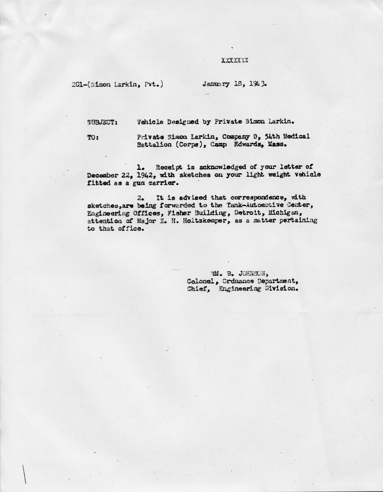 January 18, 1943 - 201 - Vehicle Designed by Private Simon Larkin - Colonel William B. Johnson, Chief Engineering Division, Ordnance Department to Private Simon Larkin details