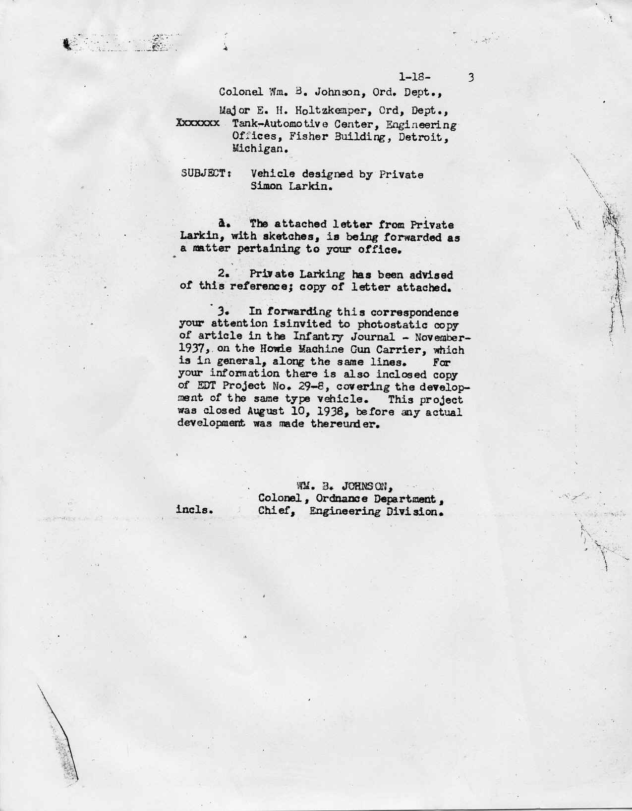 January 18, 1943 - Vehicle Designed by Private Simon Larkin - Colonel William B. Johnson, Chief, Engineering Division, Ordnance Department to Major E. H. Holtzkemper, Ordnance Department, Tank Automotive Center details